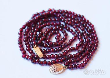 Anello in oro giallo 750 con cabochon di corallo rosso naturale. Collana con perle coltivate e pietre di lapislazzuli. Collana di granati a 2 fili. Orologino meccanico da donna da taschino o ciondolo con ambra baltica naturale di provenienza russa.