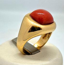 Anello da donna in oro giallo massiccio lucido, al centro spicca un magnifico cabochon di corallo rosso naturale, dalla forma bombata e lucida.