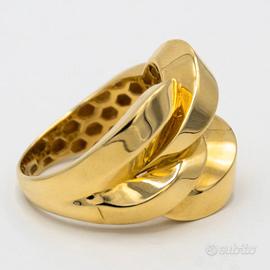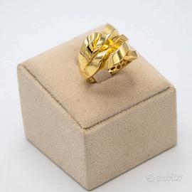 Anello donna a fascia in oro giallo 18 kt grammi 5,6 con una grossa treccia centrale. La lavorazione è lucida e la misura è n° 22. Di grande effetto è un prodotto made in Italy munito di marchio di fabbrica come da legge e completo di confezione e certificato di qualità rilasciato dalla Gioielleria.