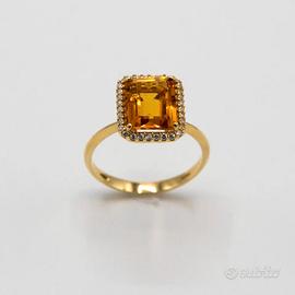 Anello donna in oro giallo 18 kt grammi 3,8 con un topazio giallo rettangolare circondato da zirconi bianchi. L’ anello misura n° 16 e volendo si può portare a misura su richiesta. Prodotto made in Italy munito di marchio di fabbrica come da legge e completo di confezione e certificato di qualità rilasciato dalla Gioielleria.