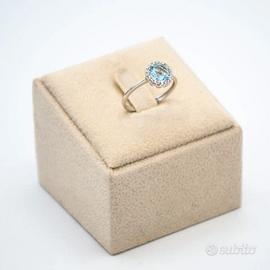 Anello donna in oro bianco 18 kt grammi 2,3 con un quarzo azzurro centrale di forma tonda circondato da zirconi di colore bianco. L’ anello misura n° 14 e volendo si può portare a misura su richiesta.
