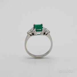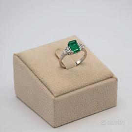 Anello G U L V I N da donna in oro bianco 18 kt grammi 3,6 con uno Smeraldo di taglio rettangolare e di ct 1,08 e 6 Diamanti laterali taglio brillante di ct 0,38 complessivi colore F vs. L’ anello misura n° 14 e volendo si può portare a misura su richiesta. Prodotto made in Italy completo di confezione e certificato di qualità rilasciato dalla Gioielleria.