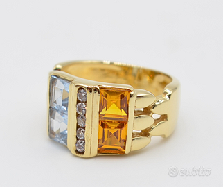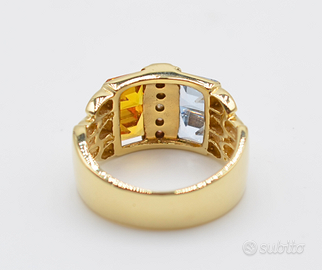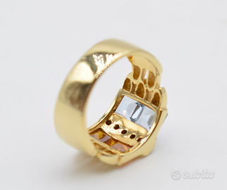 Al centro della sua struttura imponente, sono incastonati due magnifici topazi naturali: uno di un vivido celeste, l’altro di un caldo giallo citrino. Questi gemme, con le loro sfumature complementari, creano un contrasto cromatico accattivante e sofisticato. A valorizzare ulteriormente la composizione, brillano tra i topazi zirconi naturali con taglio brillante, che aggiungono un tocco di scintillio e luminosità, esaltando la preziosità dell’oro.