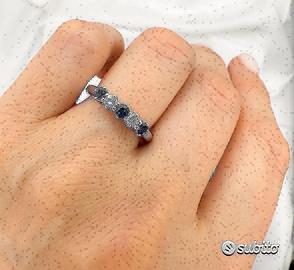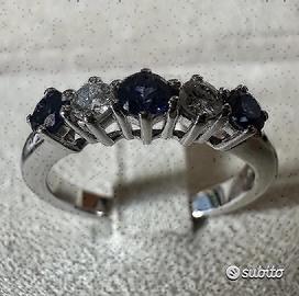 ANELLO FEDINA A 5 PIETRE IN ORO BIANCO 750°/°° - 18 carati ALTERNATA CON DIAMANTI NATURALI TAGLIO BRILLANTE E ZAFFIRI NATURALI, DI PROVENIENZA CEYLON (SRY-LANKA) E DI TAGLIO TONDO ZAFFIRI ct. : 0,46 DIAMANTI ct. : 0,16 - colore : G - purezza : VS PESO ORO gr. : 3,90 MISURA DEL DITO: 12 1/2 ( possibile cambiare misura dell'anello per qualsiasi informazione contattateci) spedizione con assicurata tramite Poste Italiane