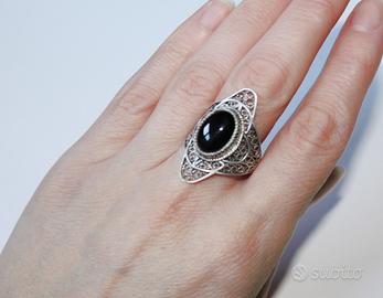 Bellissimo anello filigrana in argento 925 di lavorazione artigianale con Cabochon di Onice nera. Per ulteriori informazioni contattare. Spedisco.
