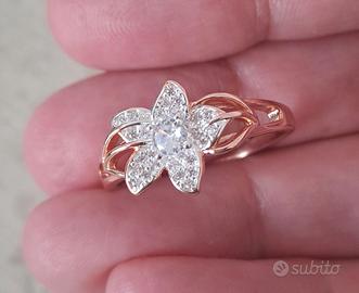 Elegante anello a forma di fiore con petali tempestati di zirconi. La montatura colore oro aggiunge un tocco di calore e raffinatezza. Design floreale unico. Zirconi scintillanti. Marchio RG585. Fornito con la confezione regalo.