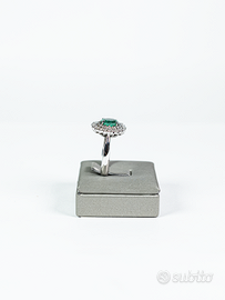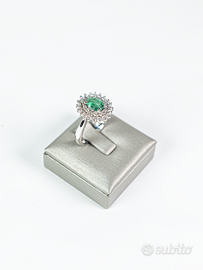 Anello fiore in oro 750 18kt con smeraldo di 0.95ct e pavè di diamanti di massa complessiva stimata 0.42ct, colore e purezza stimate H-VVS.