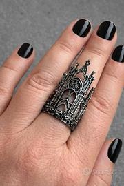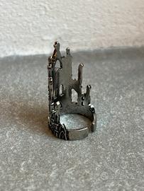 Anello in metallo con facciata lavorata a rilievo raffigurante una cattedrale/castello in stile gotico.