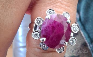anello con grande rubino e 8 brillanti montato su oro bianco valore da nuovo sui 4500 euro. peso anello circa 10 grammi.