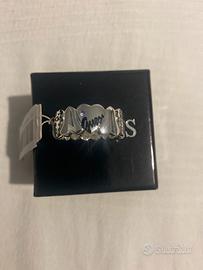 L'anello è composto da cuori con diversi motivi, uno con brillantino. Gli inserti sono metallici uniti tra loro da fili elastici che consentono una certa adattabilità.Il diametro minimo è 19 mm.