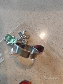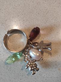 Anello in acciaio misura regolabile con 5 ciondoli di cui una bambina un bambino una pietra verde, una bordeaux a forma di Goccia e una perla. Venduto con bustina regalo