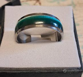 Anello moderno e raffinato in acciaio inox con fascia centrale color verde petrolio/blu dall’effetto lucido e leggermente iridescente.