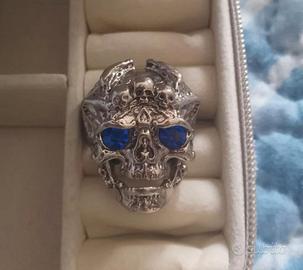 anello in acciaio con teschio fin argento occhi in pietra fin blu misura regolabile mai indossato