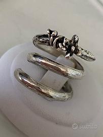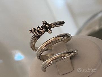 Anello scultura in argento 925, realizzato a mano con la tecnica a cera persa. E’ un pezzo unico. Anello a spirale, con pugnale brunito, attentamente realizzato a cera persa. Veste un dito dalla misura 12 alla 18, essendo aggiustabile in larghezza, grazie alla spirale. Articolo nuovo, con scatola ed etichetta. Argento 925 nichel free.