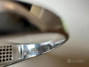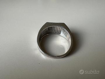 Vendo anello in argento 925 dal peso di circa 12 g incastonato di pietre bianche e nere. La circonferenza interna dell’anello misura circa 6,4 cm e il raggio è pari a circa 2,0 cm.