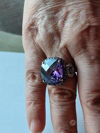Anello in argento 925 Materiale argento 925 Pietra sintetica color ametista Pietre secondarie zirconi Larghezza della pietra 17mm Peso complessivo 12.5 grammi Misura 16 Nuovo con cartellino