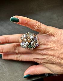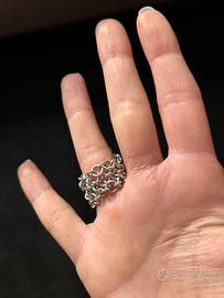Splendido anello a grappolo artigianale in argento. La struttura è composta da una morbidissima fascia in maglia metallica che si adatta perfettamente al dito, garantendo un comfort incredibile.