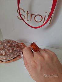 Anello in argento 925 dal design moderno. La fascia si avvolge attorno al dito compiendo più giri a spirale. La pietra, di forma cilindrica e perfettamente levigata, è vera ambra baltica arancione con foglioline e intrusioni naturali al suo interno. Misura: 14.
