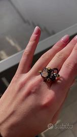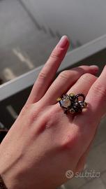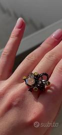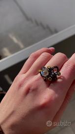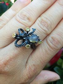Pezzo unico! Anello artigianale in argento massiccio 925 rodiato black con labradorite africana naturale e peridoti del Pakistan. Misura 16 / US 7,5 / FR 56, ma regolabile.