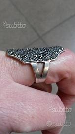Grande anello in argento, completamente lavorato, con strass color bronzo.