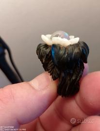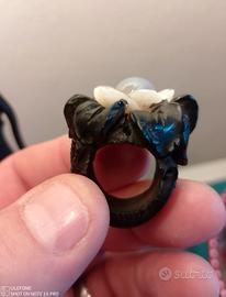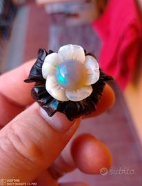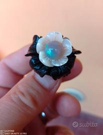 BELLISSIMO E MOLTO PARTICOLARE ANELLO IN LEGNO DI EBANO CON FIORE DI MADRE-PERLA LAVORATA E BIANCHISSIMA CON AL CENTRO OPALE ROTONDO LUMINOSISSIMO