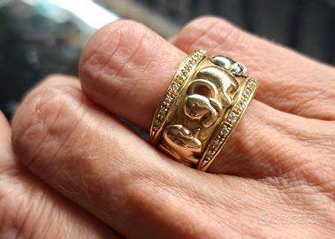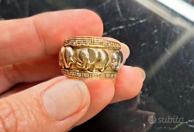 anello in oro con 3 elefanti: in oro bianco, giallo e rosso. con diamantini. peso 14 gr. usato