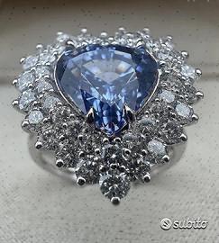 ANELLO IN ORO BIANCO 750°/°° - 18 carati CON DOPPIO GIRO DI DIAMANTI* NATURALI TAGLIO BRILLANTE E ZAFFIRO NATURALE, DI TAGLIO A CUORE DI PROVENIENZA CEYLON (SRY-LANKA) CON VERIFICA ACG DOTT. PAOLO ORSINI n° 7213425 PESO ANELLO gr. : 6,20 44 DIAMANTI ct. : 1,52 - colore : G - purezza : VS ZAFFIRO: ct. 4,23 MISURA DEL DITO: 15 ( possibile cambiare misura dell'anello per qualsiasi informazione contattateci) altre foto a richiesta via email spedizione con assicurata tramite Poste Italiane