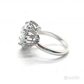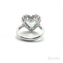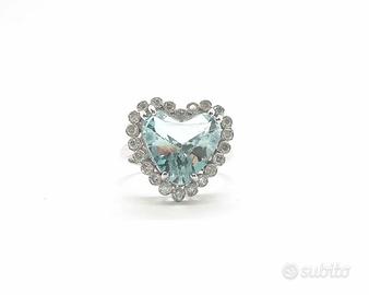 Anello in oro bianco 750 dal peso di 6,3 grammi, impreziosito da un’acquamarina taglio cuore dal peso stimato di 6 carati, caratterizzata da un colore azzurro intenso e una raffinata trasparenza. La pietra centrale è affiancata da diamanti per un totale di 0,44 carati, che ne esaltano la brillantezza con eleganza. Il design armonioso unisce freschezza e raffinatezza, rendendo l’anello un gioiello distintivo e raffinato, ideale per chi ama la preziosità delle gemme colorate.