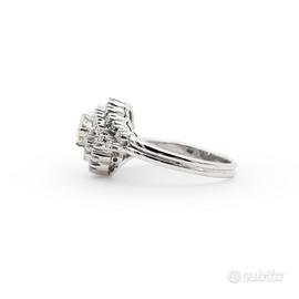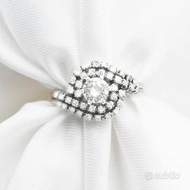 Anello in oro bianco 18 carati dal peso totale di 5,7 grammi, con un diamante centrale da 0,40 carati e pavé di diamanti per un totale di 0,48 carati. I diamanti, di colore I e purezza S, aggiungono un tocco di brillantezza raffinata, ideale per chi cerca un gioiello elegante e luminoso.