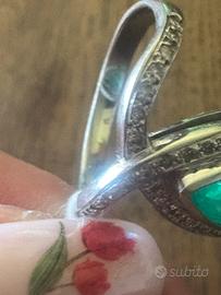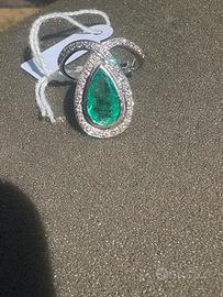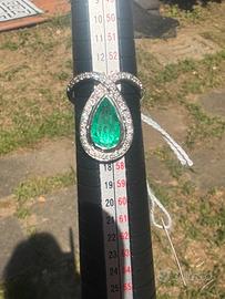 Anello in oro bianco 750, diamanti e grande smeraldo centrale a goccia. Molto luminoso e di grande effetto.