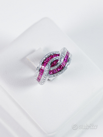 Anello in oro bianco 750 18kt con rubini di massa complessiva stimata 1.56ct e diamanti di massa complessiva stimata 0.55ct, colore e purezza stimate G-VS. Spessore max. 12.08mm Misura 15 G. 6.40 Gioiello ricondizionato