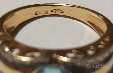 Anello in oro 750 con pietra azzurra, probabilmente acquamarina e brillantini.