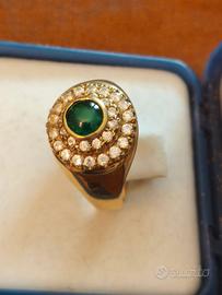 L' ANELLO DI OTTIMA FATTURA ORAFA PRESENTA UNO SMERALDO CENTRALE TAGLIO CABCHON PER CIRCA 30 PUNTI DI CARATO CHE EMANA BEI RIFLESSI. LO SMERALDO SI SOVRAPPONE A DUE CERCHI CONCENTRICI SUI CUI SONO INCASTONATI 33 PICCOLI ZAFFIRI BIANCHI DI BELLA LUCE PER UN TOTALE DI 33 PUNTI DI CARATO.