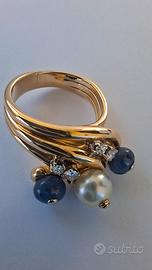 Anello in oro giallo, diamanti, zaffiri, perla, di