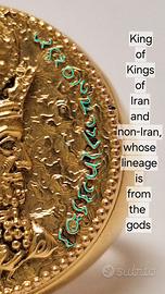 Il design ispirato alla moneta raffigura il ritratto incoronato del re, circondato dalla sua leggendaria titolazione in medio persiano: "L'adoratore di Mazda, il divino Shapur, Re dei Re dell'Iran e non-Iran, la cui discendenza deriva dagli dei".