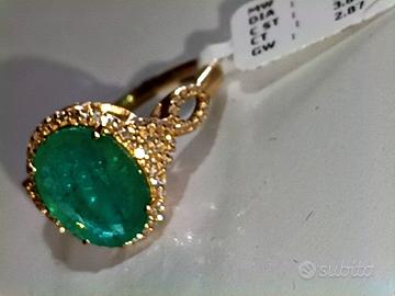 Esclusivo Anello in oro giallo massiccio con Smeraldo naturale dello Zambia per Ct. 3.86 taglio Ovale colore Verde intenso e contorno di Diamanti naturali e per Ct. 0.22