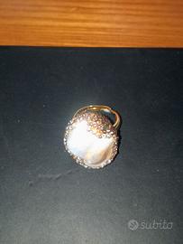 Anello in ottone placcato oro regolabile a misura con Grande perla barocca naturale è tutti cristalli dorati e bianchi su tutto l'anello