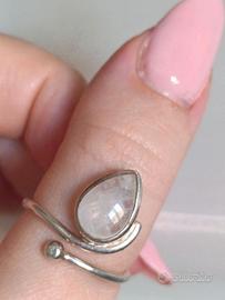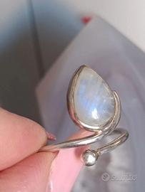 Questo anello in labradorite bianca naturale (conosciuta anche come Moonstone) sprigiona riflessi azzurro-lattei che cambiano con la luce, come la luna che danza tra le nuvole.