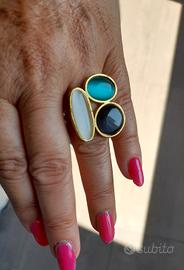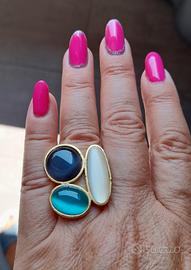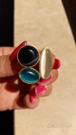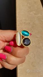 Anello in metallo dorato con pietre colorate di alta bijouterie. Nuovo mai usato. Diametro 2,02 cm