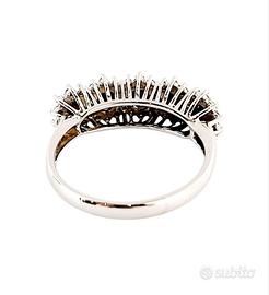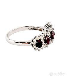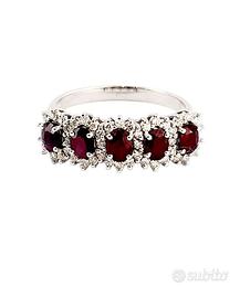 Anello modello veretta fantasia con Rubini centrali ;taglio ovale e contorno di Diamanti taglio brillanti lavorato in oro bianco 18kt-750/1000- Grammi 3.73