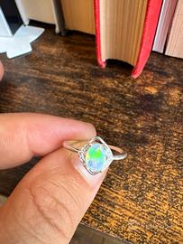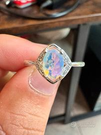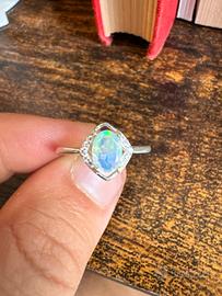 Elegante anello in argento con opale naturale centrale tagliato a sfaccettature e zirconi laterali che ne esaltano la luminosità.