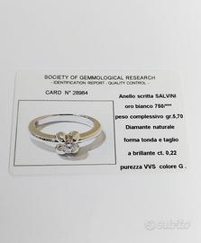 Anello in oro 18 KT( 750 ‰ ) di grammi 5.70 impreziosito da un diamante naturale taglio a brillante di ct. 0.22 purezza VVS colore G. Scritta Salvini.