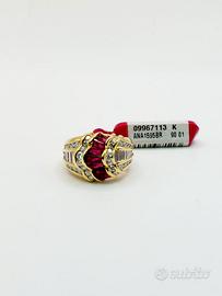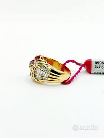 Anello in oro 18 KT(750 ‰) di grammi 13.50 impreziosito da rubini naturali taglio tepper per ct. 2.02 e da diamanti naturali taglio brillante per ct. 1.09 e taglio tepper per ct. 0.79. Firmato Bibigì.