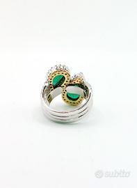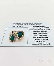 Anello in oro 18 KT(750 ‰) di grammi 15.03 impreziosito da due smeraldi naturali taglio sfaccettato per ct. 3.60 totali e da diamanti naturali taglio brillante per complessivi ct. 1.40 purezza VS colore G.