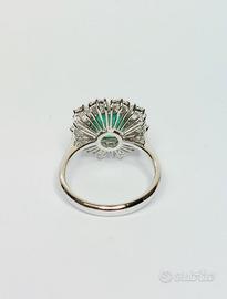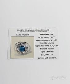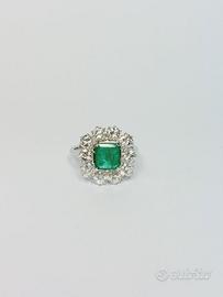 Anello in oro 18 kt ( 750 ‰ ) di grammi 5.60 impreziosito da uno smeraldo naturale taglio sfaccettato di ct. 2.10 ca e da diamanti naturali taglio brillante per ct. 2.50 circa totali, purezza VVS colore G.