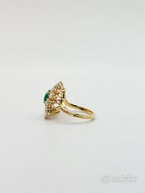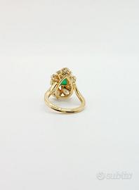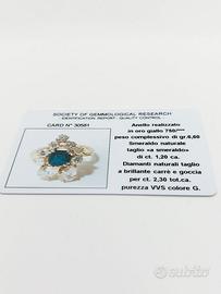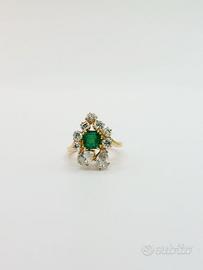 Anello in oro 18 KT ( 750 ‰ ) di grammi 6.60 impreziosito da uno smeraldo naturale taglio a smeraldo di ct. 1.20 e da diamanti naturali taglio brillante carrè e goccia per complessivi ct.2.30 ca purezza VVS colore G.