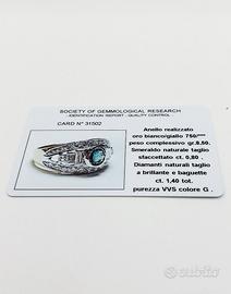 Anello in oro giallo 18 KT (750 ‰) del peso di grammi 8.50 impreziosito da uno smeraldo naturale taglio sfaccettato di ct. 0.80 e da diamanti naturali taglio brillante e baguette per complessivi ct. 1.40 tot. purezza VVS colore G.