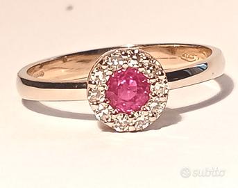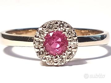 Anello Oro 18kt con 10 diamanti bianchi e Rubino rosso provenienza Birmania, una pietra veramente rara. Il grado di oro è segnato all'interno.