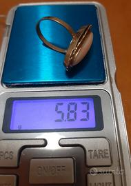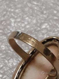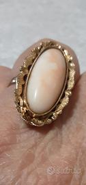 Elegante anello in oro giallo 18kt con montatura finemente lavorata, che racchiude una spola di corallo pelle d'angelo. Gr. 5.87. Misura IT 17.