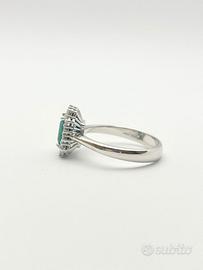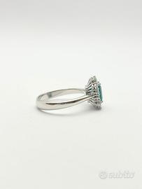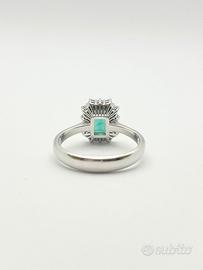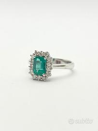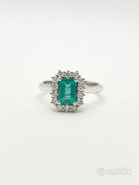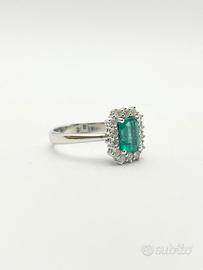 Anello in oro bianco 18KT (750 ‰) di grammi 4.60 impreziosito da smeraldo naturale taglio sfaccettato di ct 1.02 e diamanti naturali forma tonda e taglio a brillante di ct 0.56 totali; purezza VVS colore G.